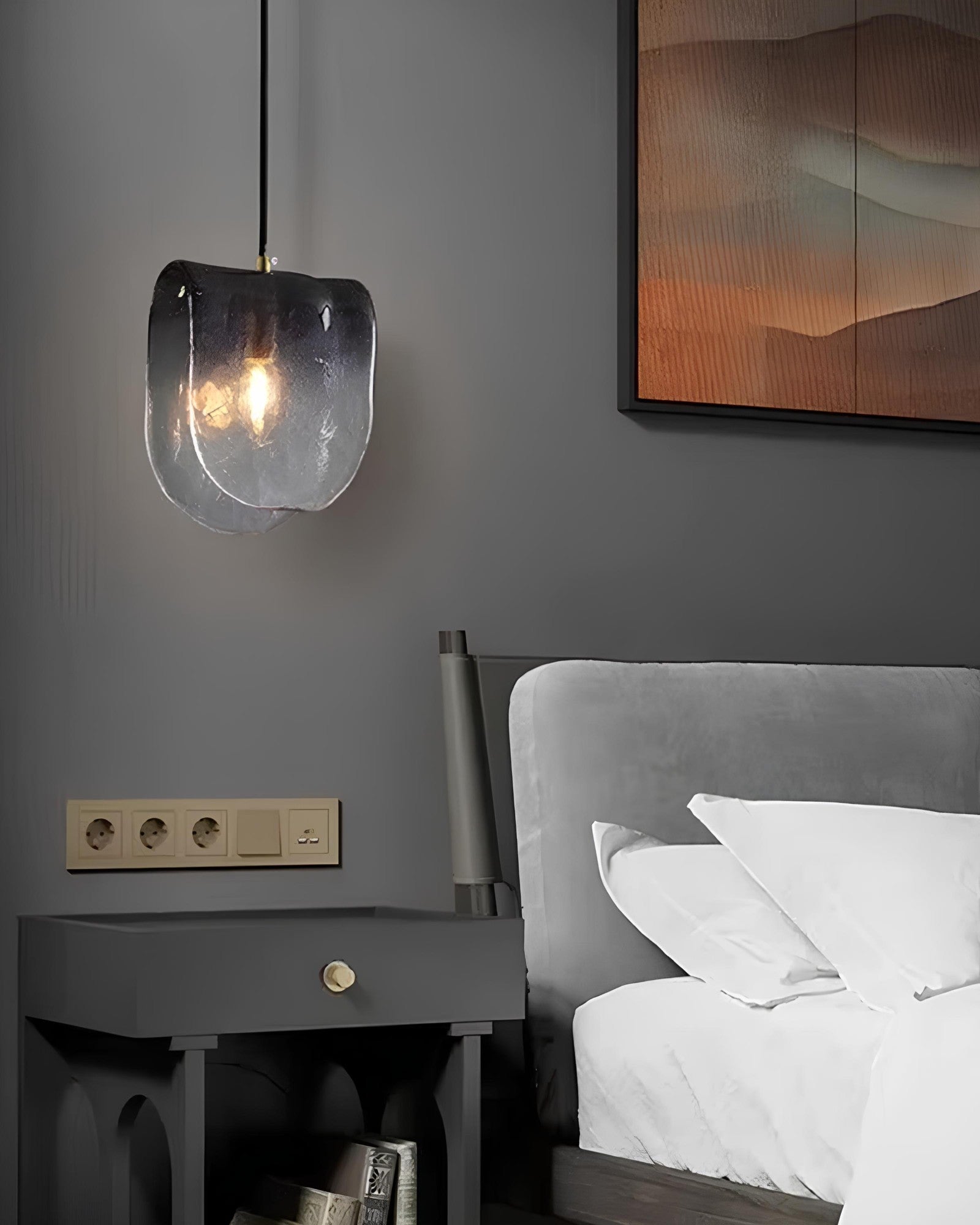 Delicata fusione di artigianalità e arte moderna, Le Verre Flottant è una lampada a sospensione che sembra scolpita nella nebbia e nella luce. Il suo paralume in vetro dalla curvatura organica, con una delicata tonalità fumé, crea un'illusione di fluttuazione, che ricorda un filo di nuvola catturato o una goccia d'acqua a metà caduta. Questo splendido pezzo offre più di una semplice illuminazione: aggiunge movimento poetico ai tuoi interni.
