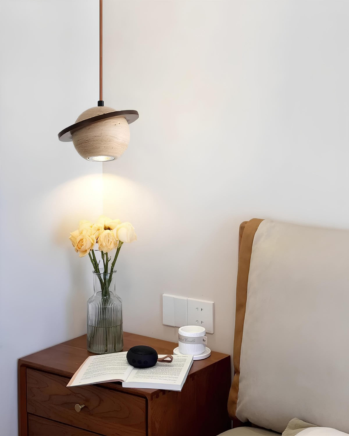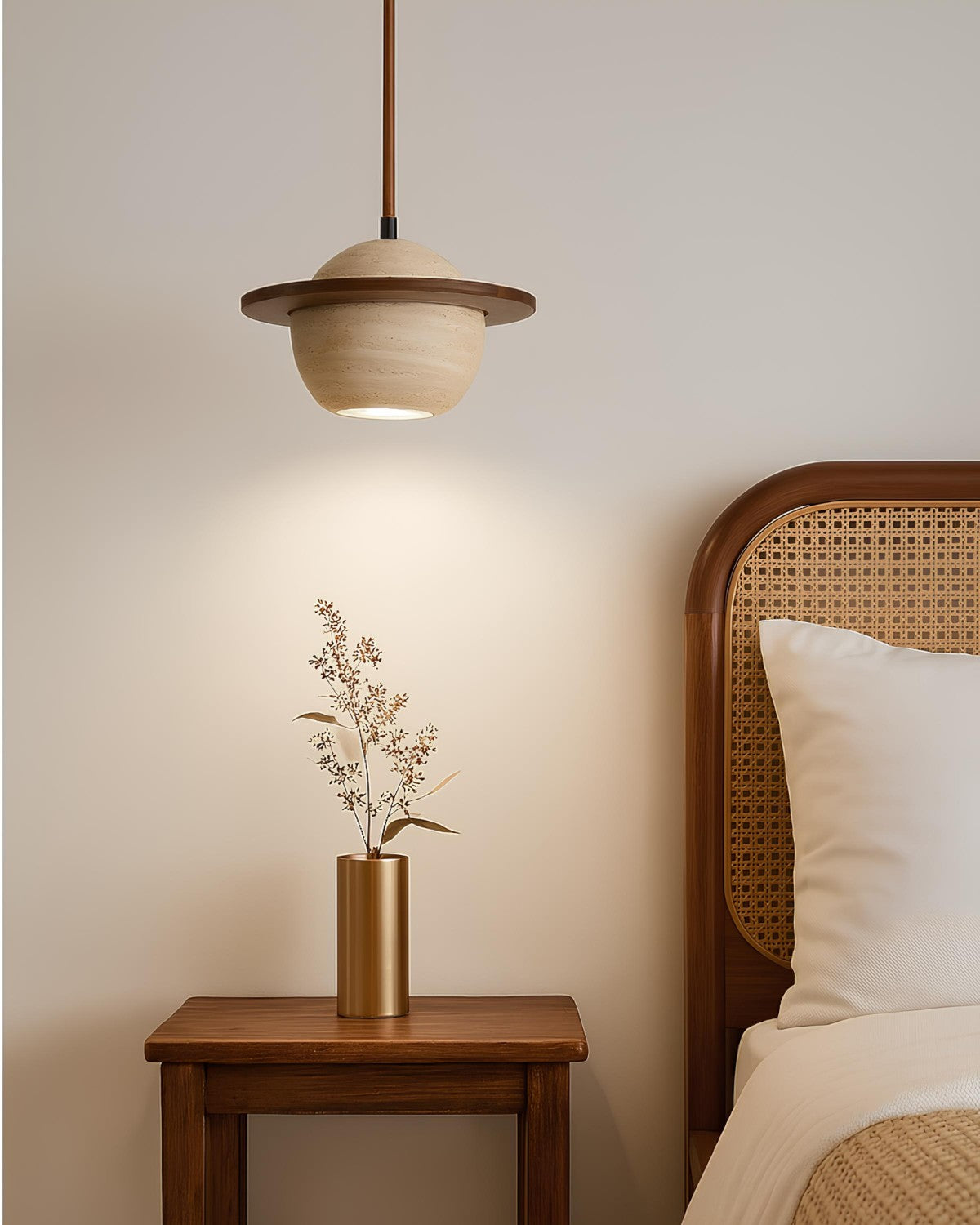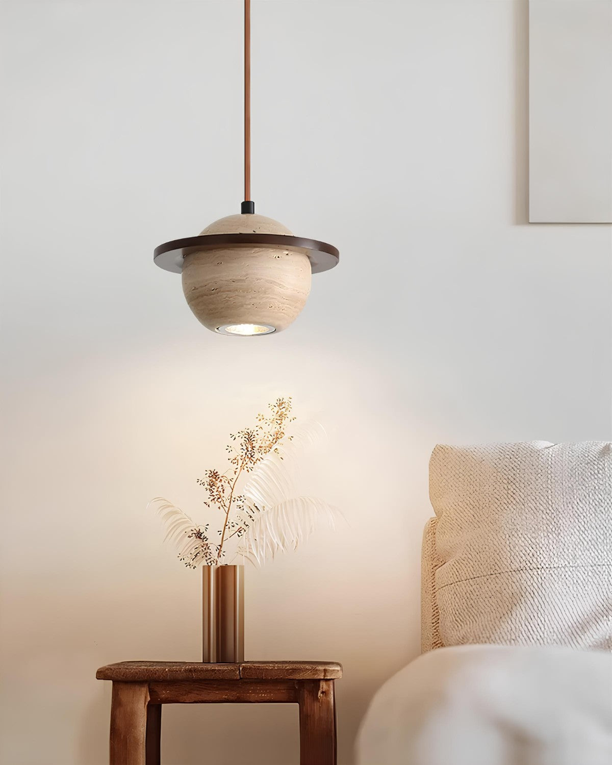 Abbellisci la tua casa con il fascino poetico di La Lumière de Saturne , una lampada a sospensione scultorea ispirata all'affascinante silhouette di Saturno. Meticolosamente realizzata in travertino naturale e impreziosita da dettagli in legno di noce, questa lampada impreziosisce i tuoi interni con una bellezza raffinata e celestiale. Che sia sospesa sopra un tavolino, in un angolo lettura o in coppia sopra una sala da pranzo, questa lampada diffonde una luce calda e soffusa, che fonde l'ambiente con le sue texture organiche e la sua forma senza tempo.