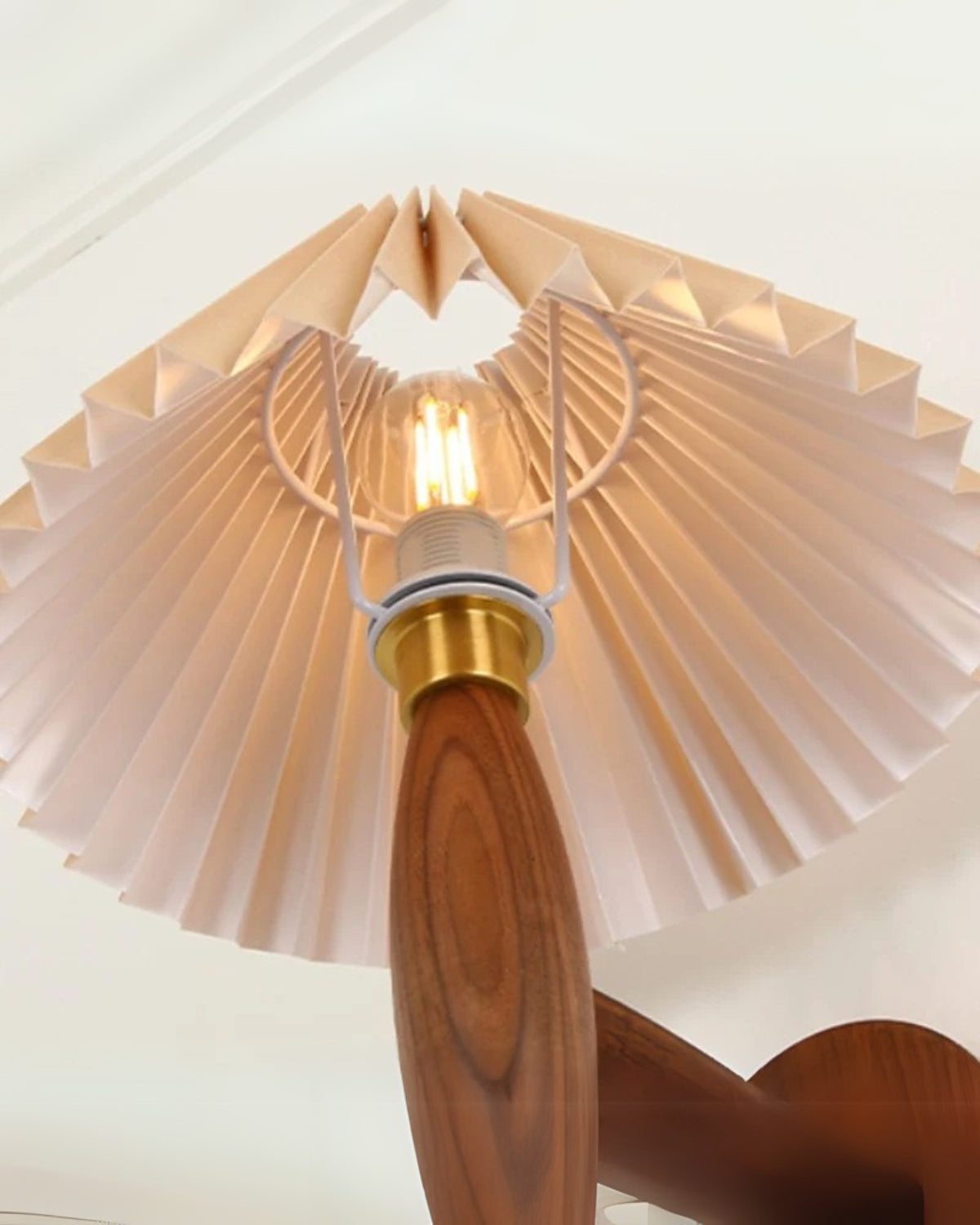 Il design è caratterizzato da un paralume plissettato, splendidamente lavorato e realizzato in legno di alta qualità, che dona calore e consistenza al vostro spazio. L'elegante braccio in legno curvo garantisce resistenza, esaltando al contempo l'aspetto sofisticato della lampada. La sua luce morbida e calda crea un'atmosfera invitante, ideale per soggiorni, camere da letto o come luce da comodino per un'atmosfera tranquilla e rilassante.