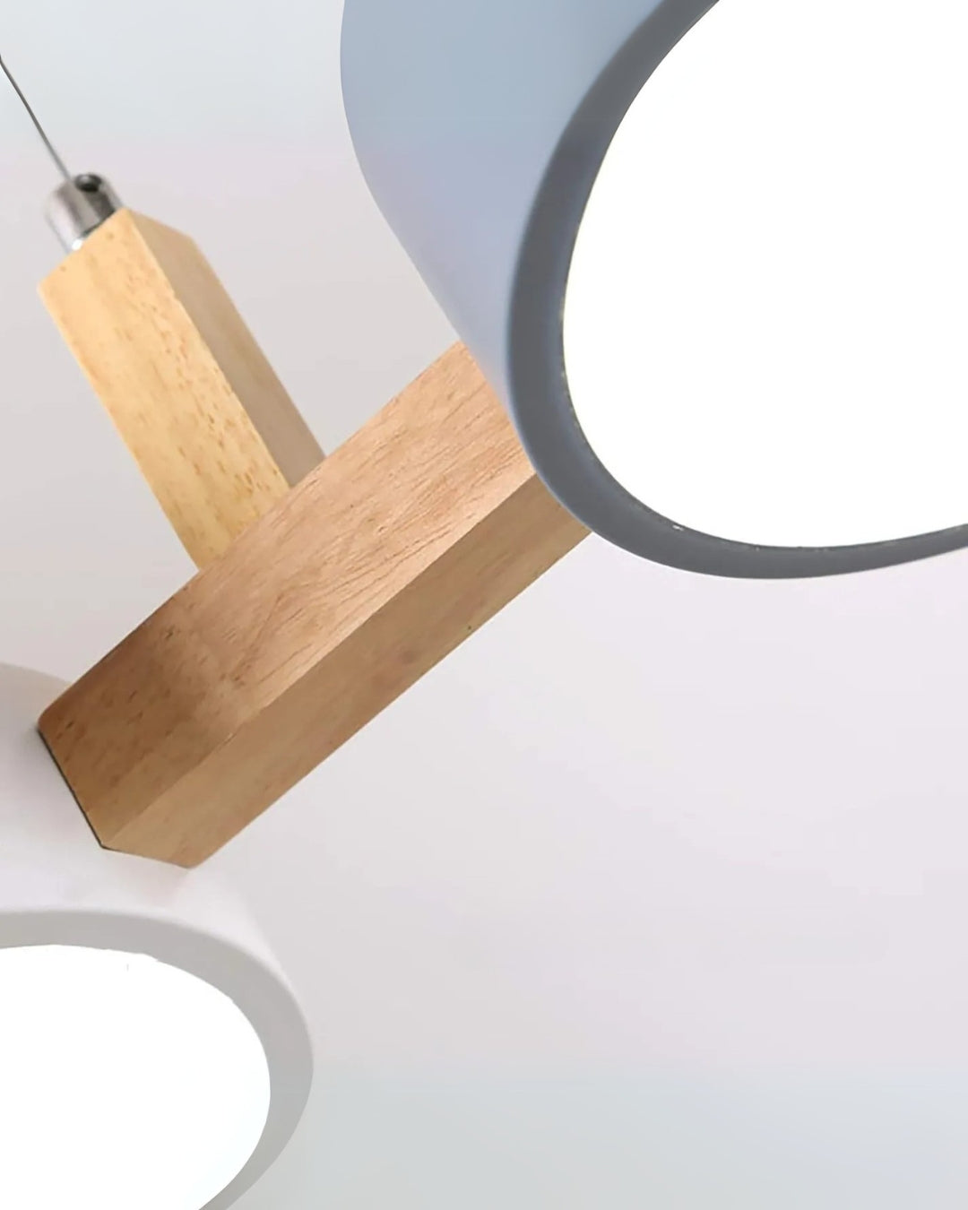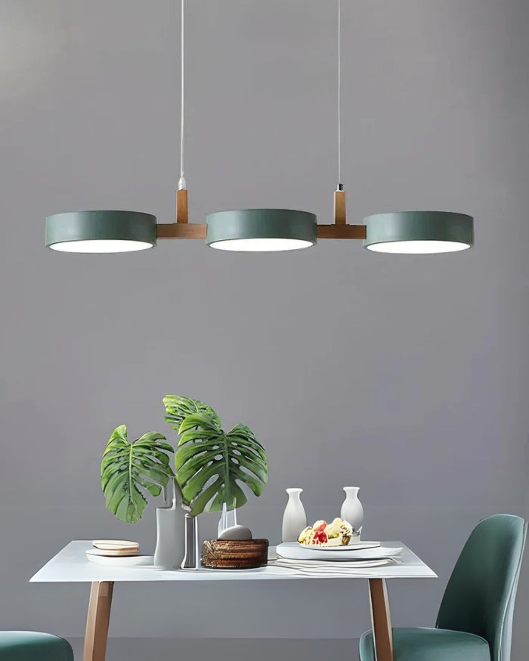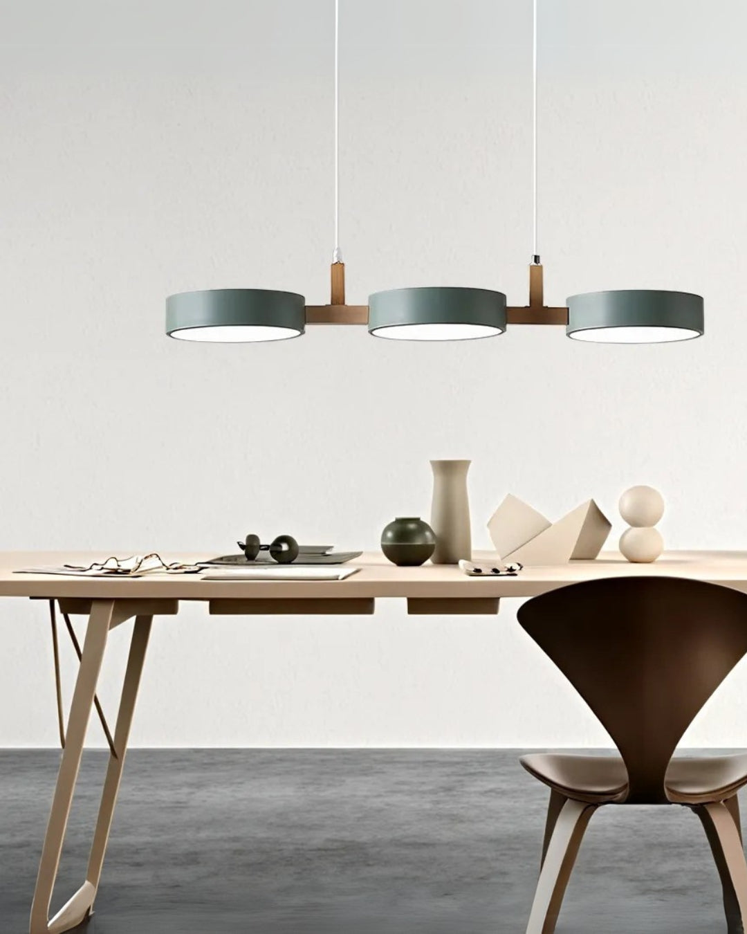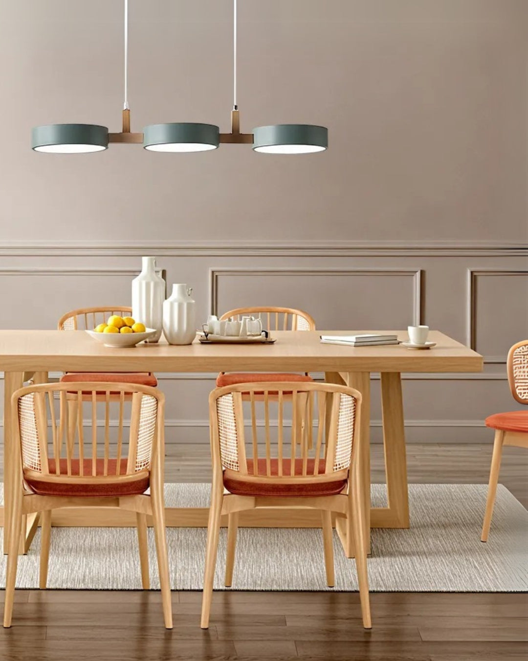 Ciascuno dei paralumi in alluminio con finitura opaca è perfettamente allineato su una trave in legno naturale, offrendo un profilo scultoreo ma minimalista. Le calde tonalità del legno contrastano magnificamente con la geometria pulita dei paralumi, creando un elemento centrale che appare al tempo stesso solido e arioso.