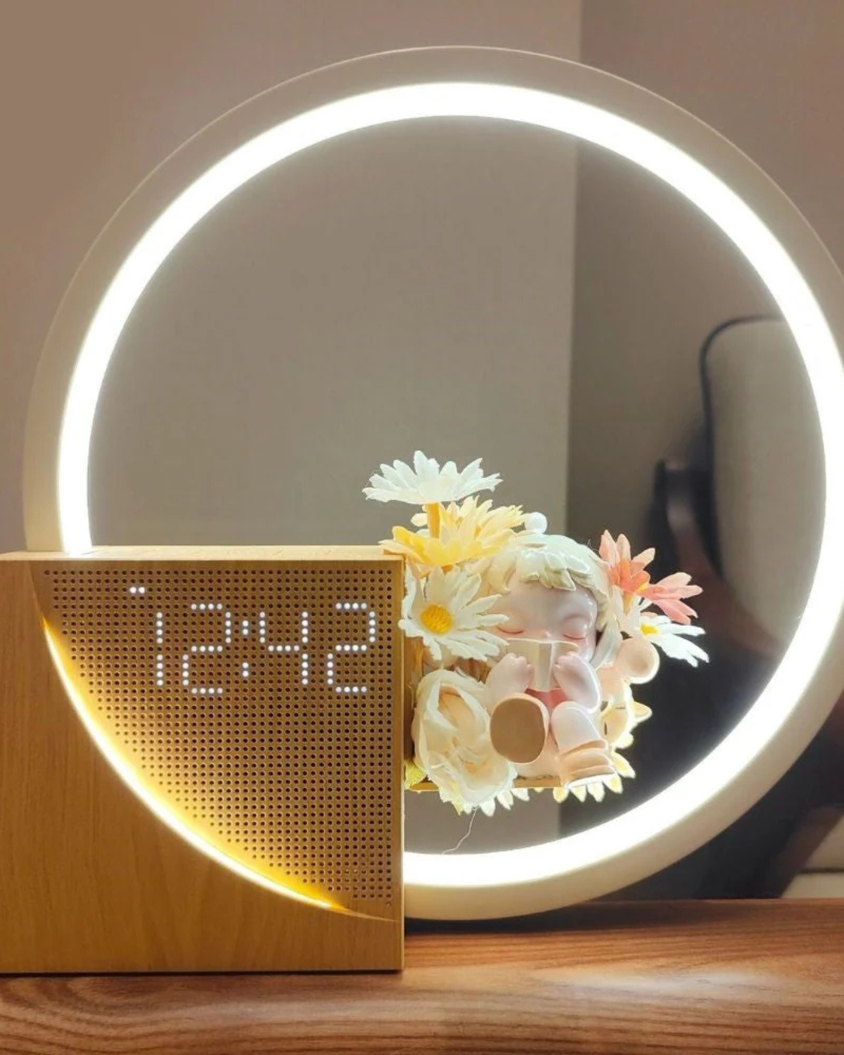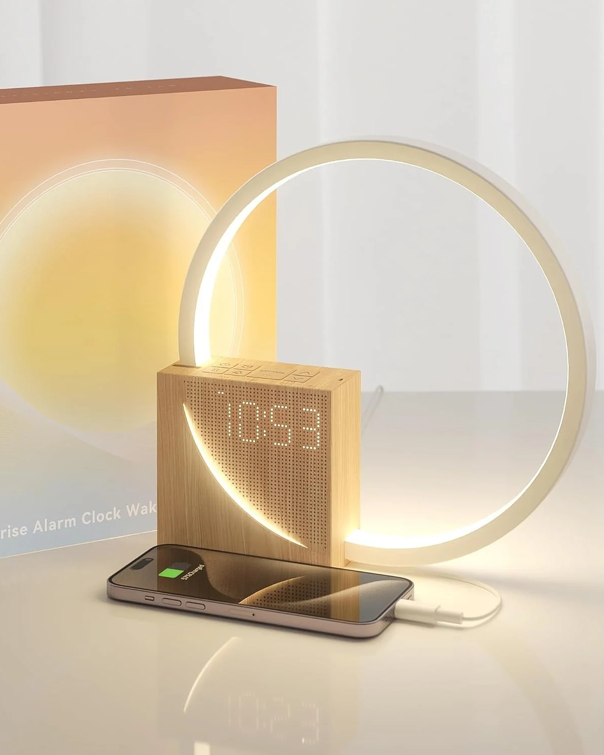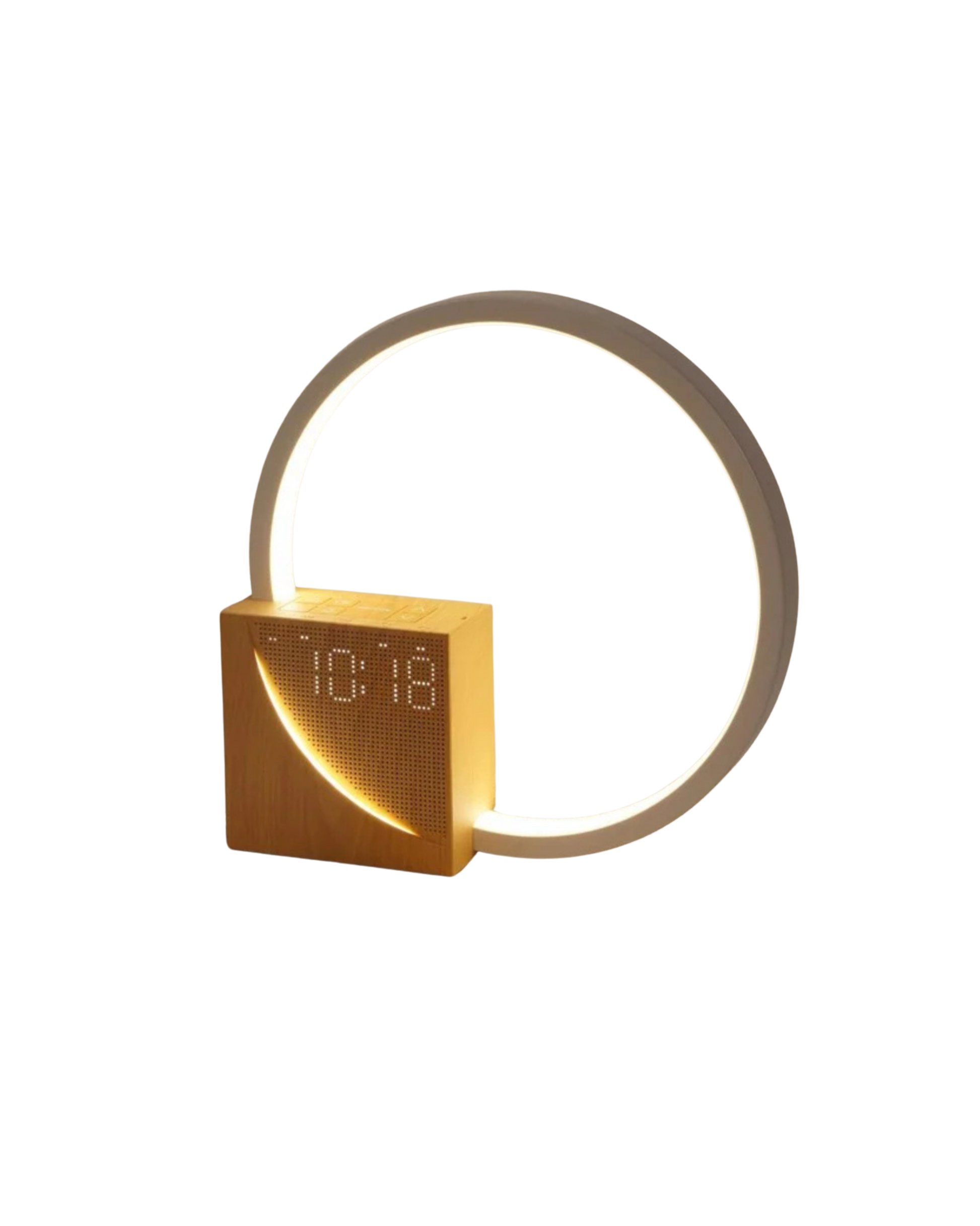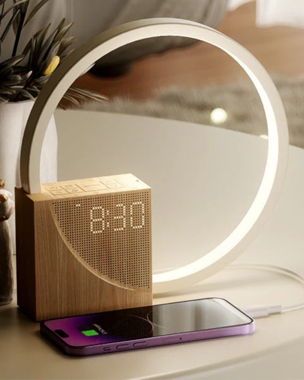 Realizzato con una calda base in legno e un alone circolare delicatamente illuminato, Le Clair Soleil imita il ritmo naturale della luce del giorno, trasformando le tue mattine in un rituale rilassante. Il display LED integrato, la delicata illuminazione ambientale e la possibilità di ricarica wireless lo rendono un'aggiunta raffinata a qualsiasi interno di ispirazione Japandi, moderna o scandinava.