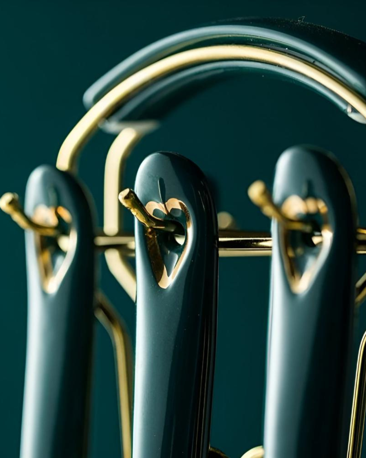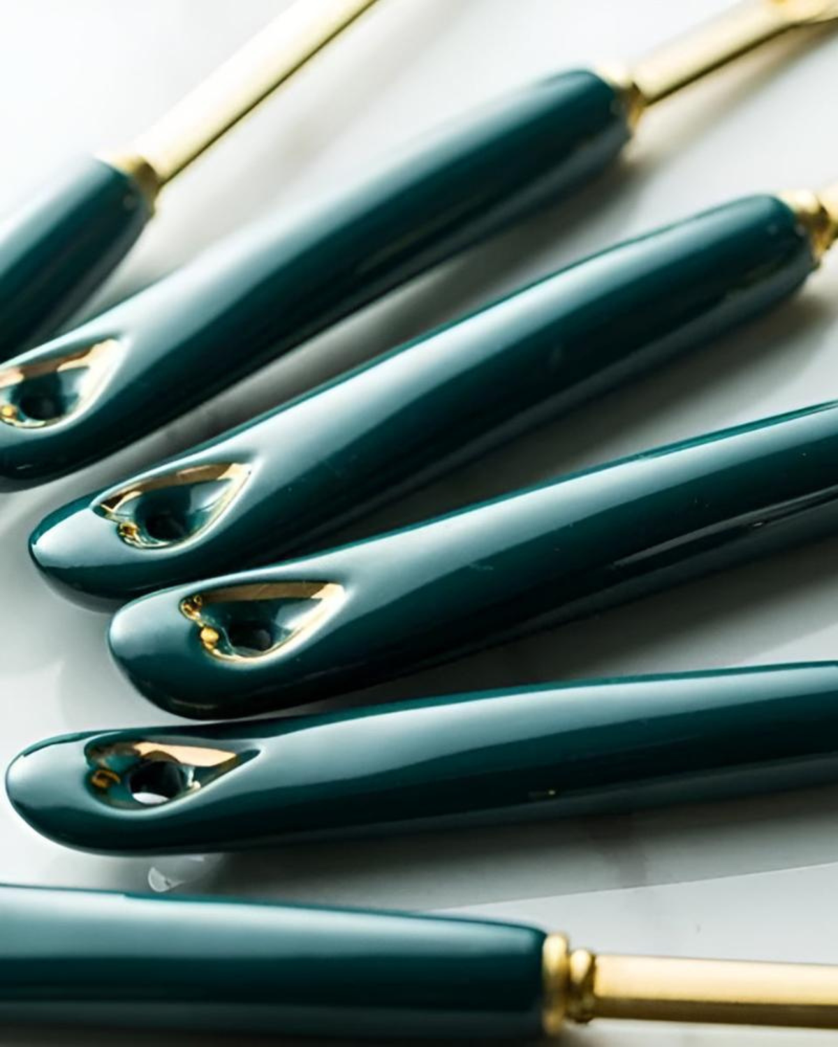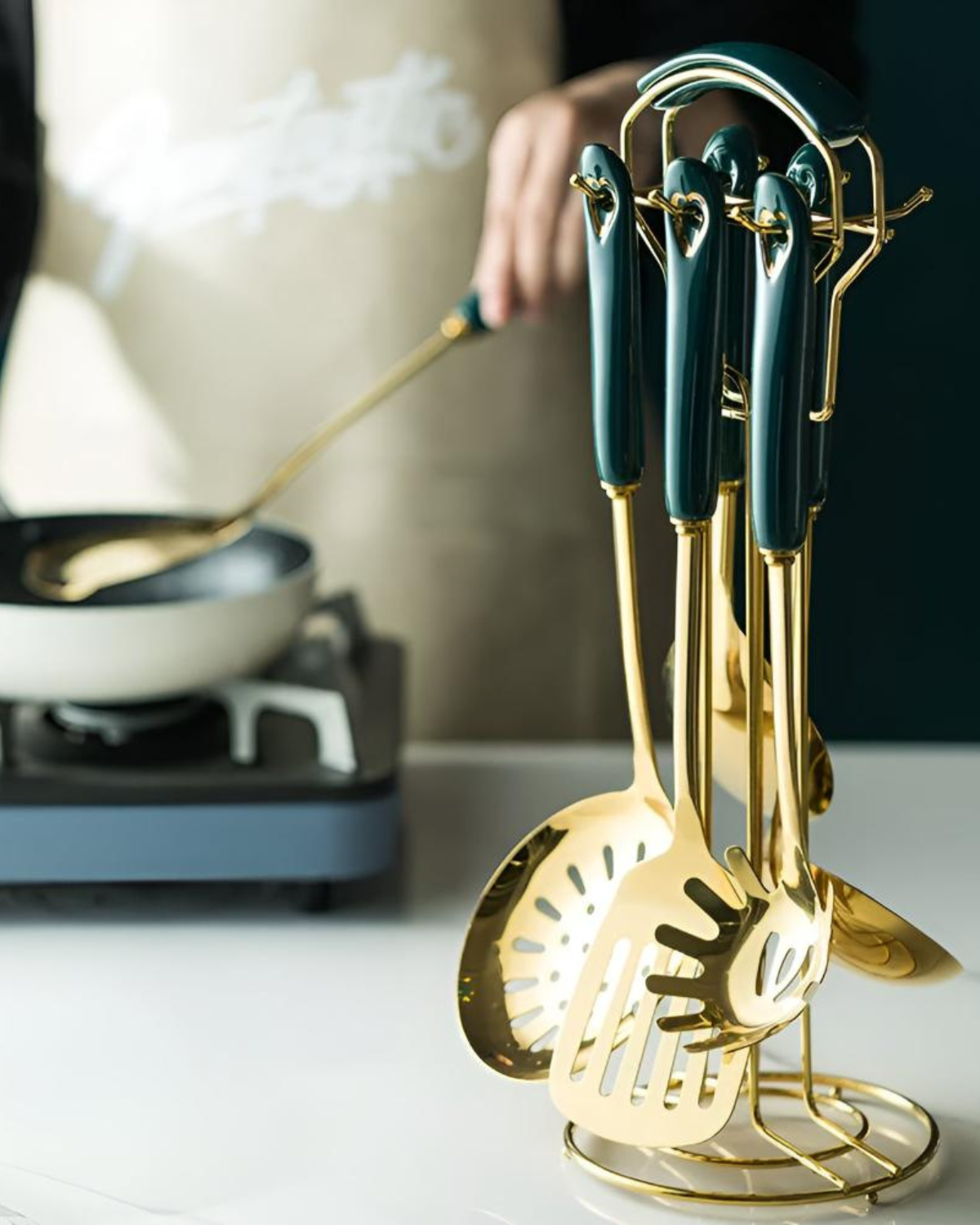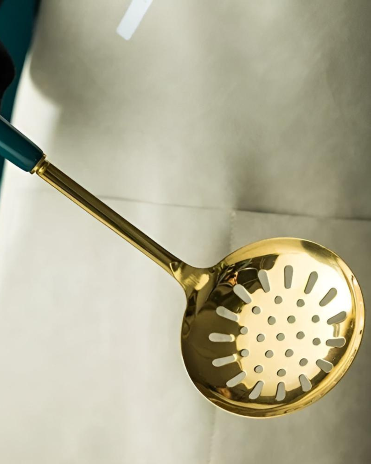 Esalta la tua esperienza culinaria con gli utensili gourmet Éclat , un mix armonioso di raffinata eleganza e design pratico. Realizzati con una finitura oro brillante, questi utensili aggiungono un tocco di opulenza alla tua cucina, mentre i manici verde smeraldo intenso garantiscono comfort e stile in egual misura.
