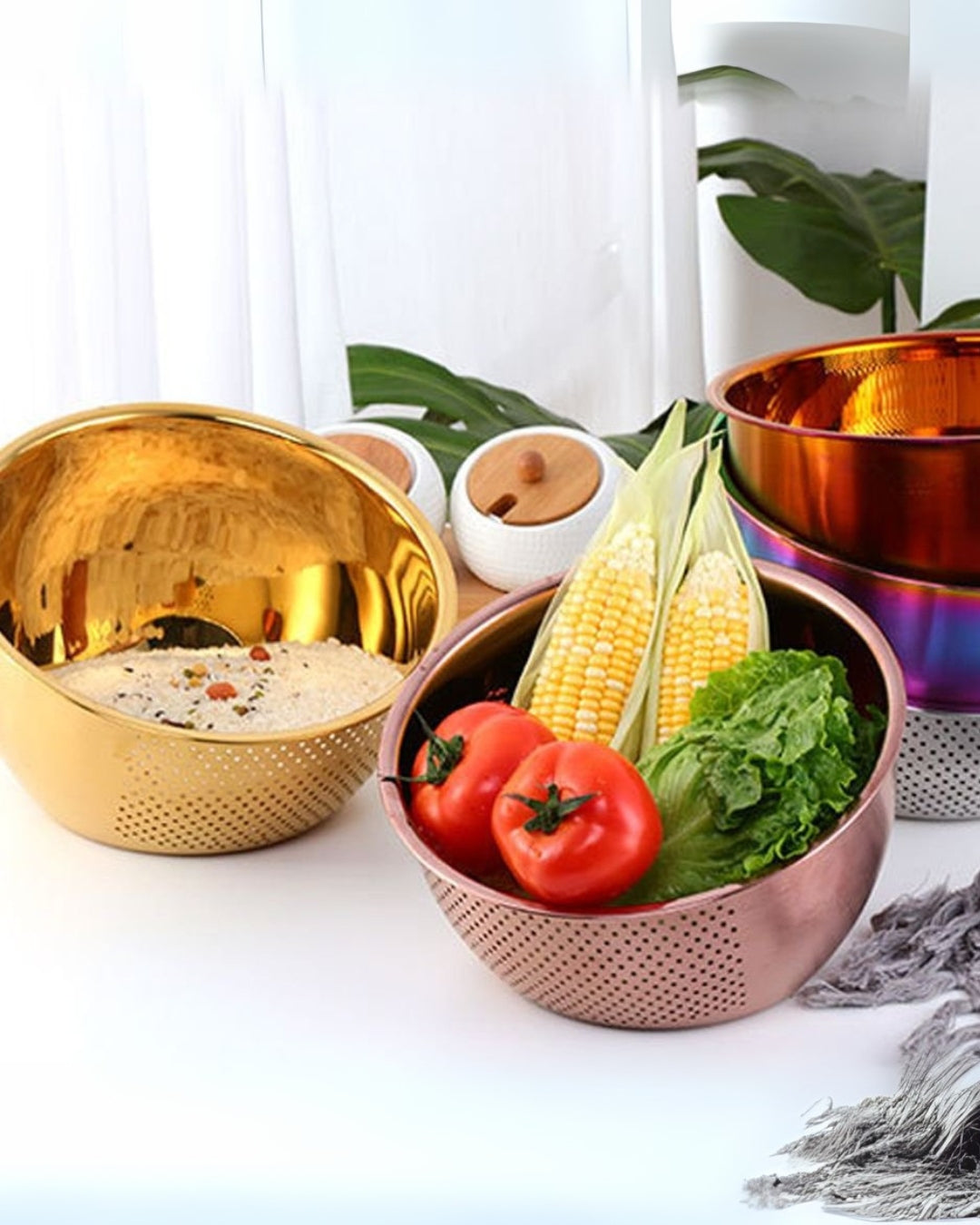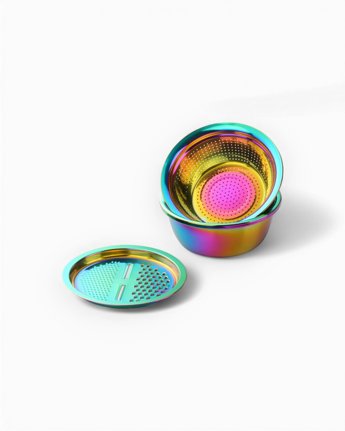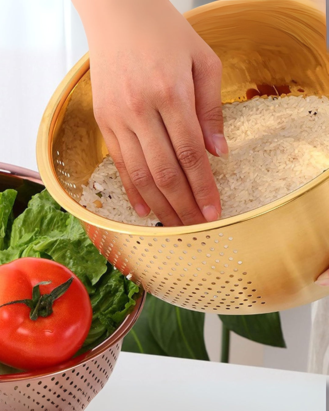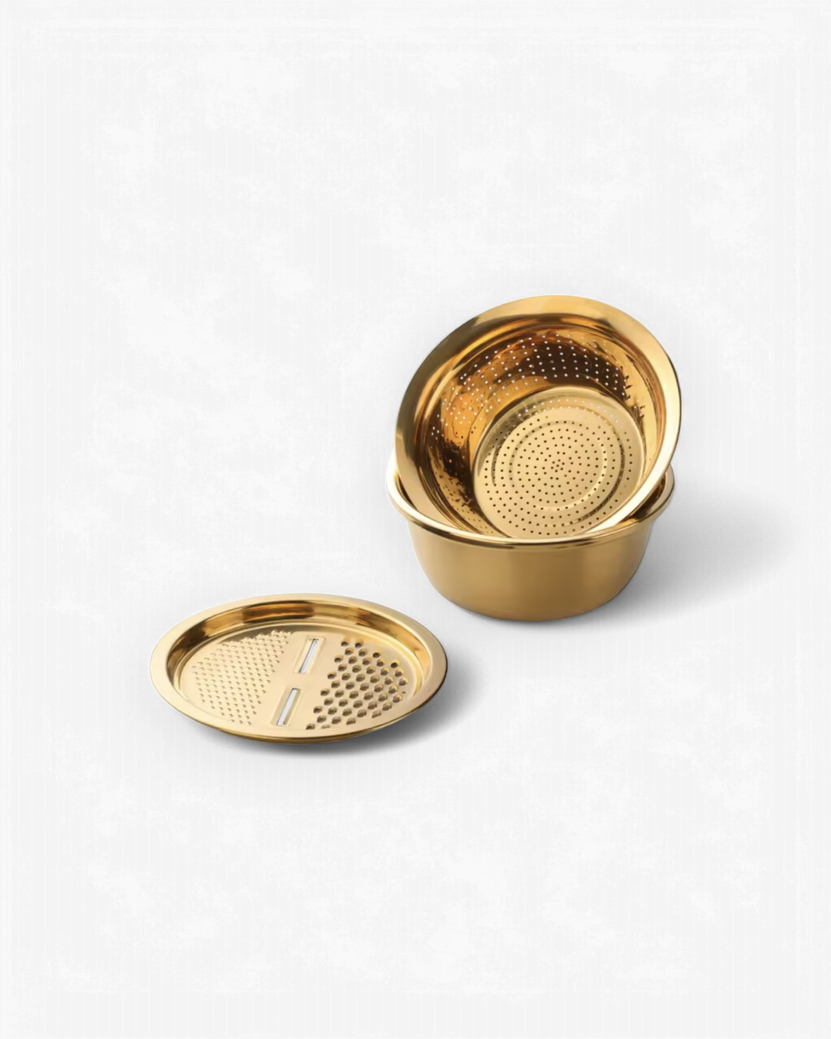 Con una superficie in acciaio inox finemente perforata, Le Doré Éclat è progettato per garantire la massima efficienza, consentendo di grattugiare e scolare senza sforzo, mantenendo gli ingredienti intatti e pronti per la fase successiva della ricetta. La lussuosa finitura dorata non solo valorizza l'estetica della cucina, ma garantisce anche una lunga durata e una facile pulizia.