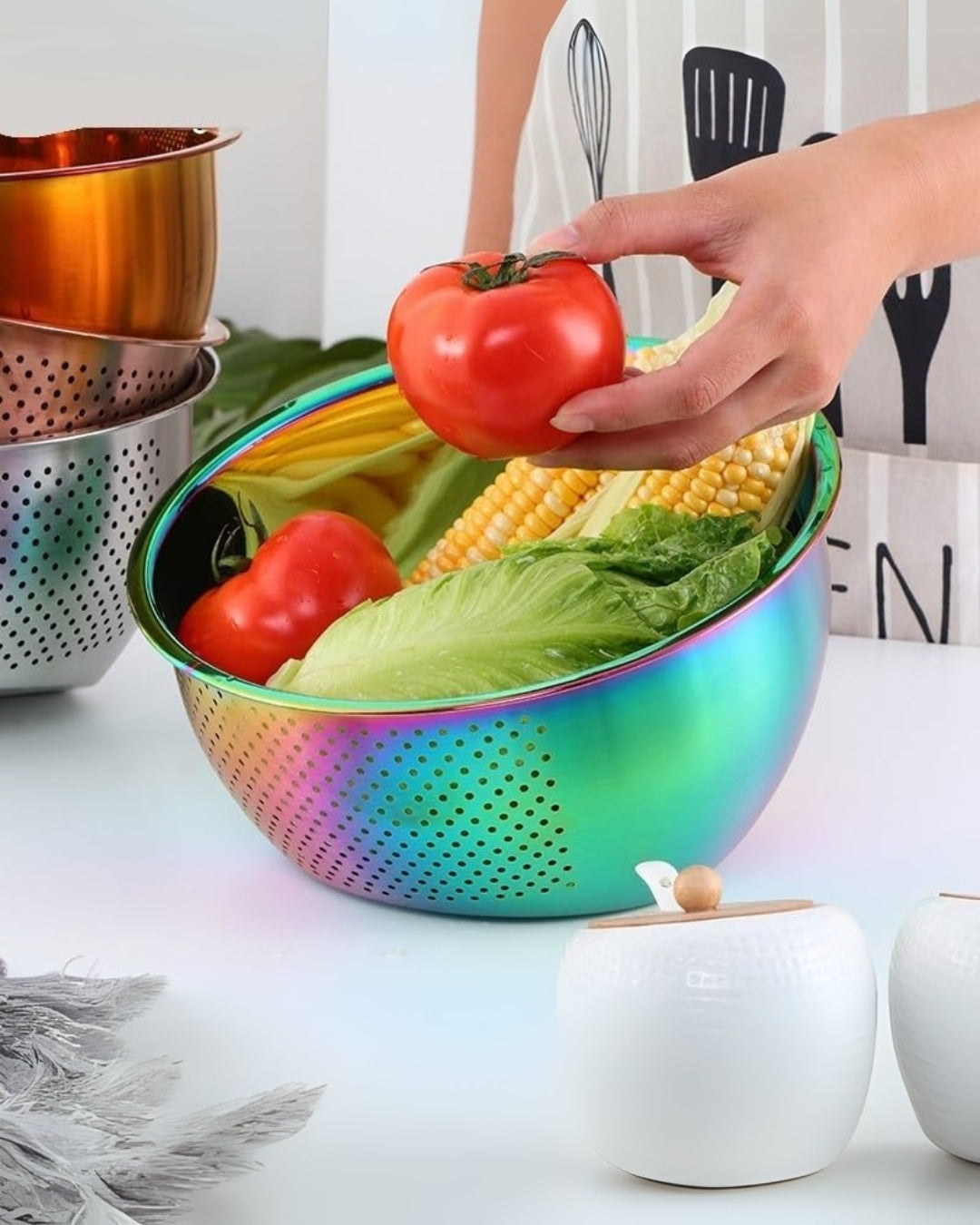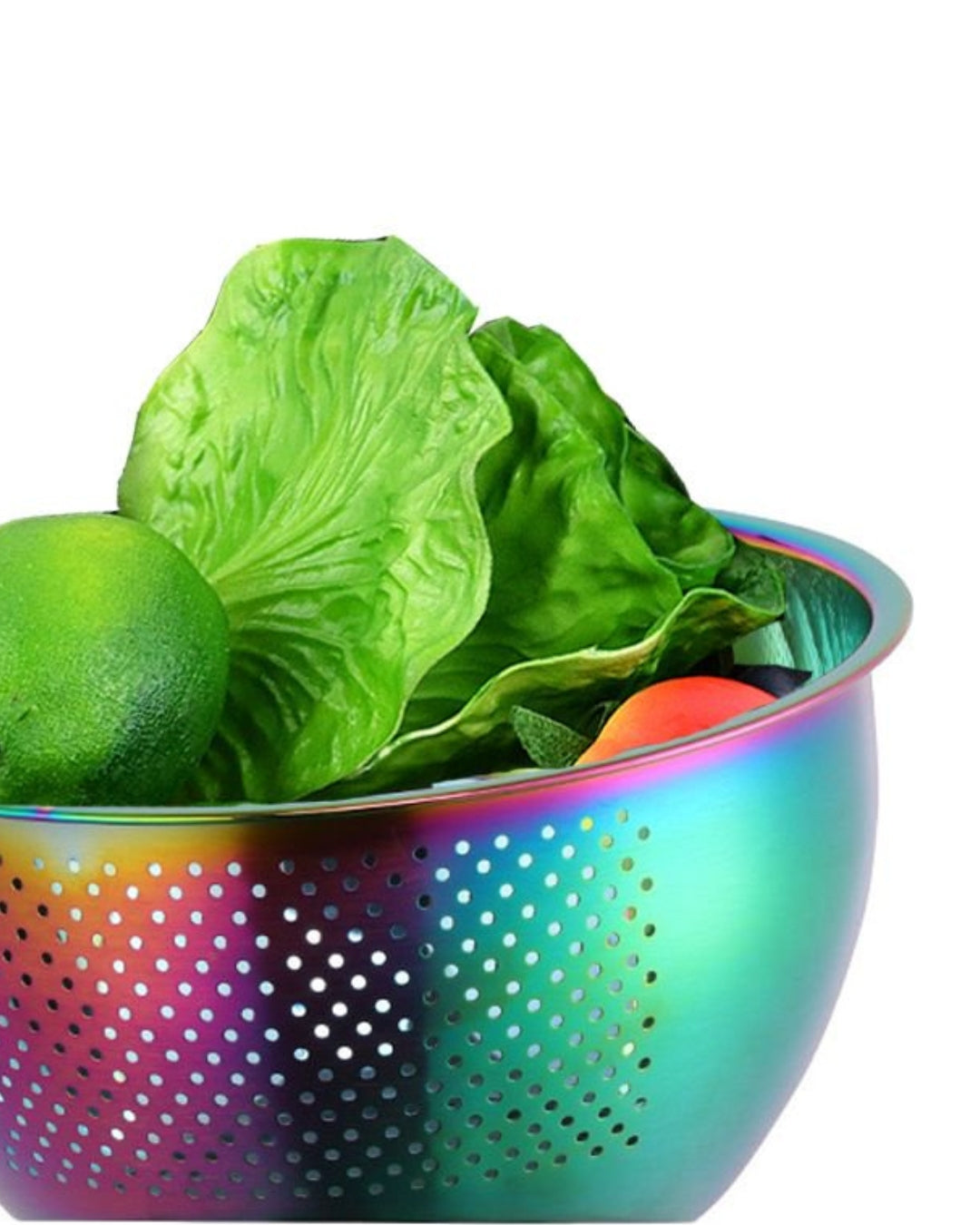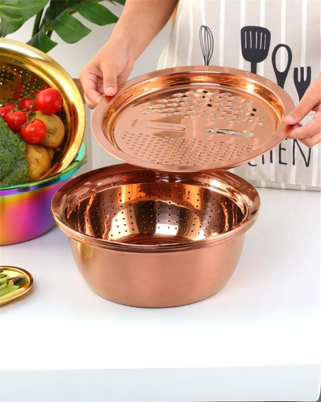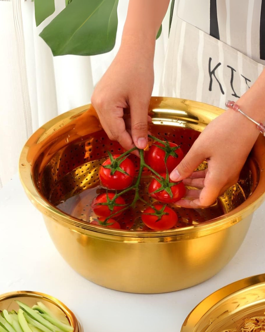 Con una superficie in acciaio inox finemente perforata, Le Doré Éclat è progettato per garantire la massima efficienza, consentendo di grattugiare e scolare senza sforzo, mantenendo gli ingredienti intatti e pronti per la fase successiva della ricetta. La lussuosa finitura dorata non solo valorizza l'estetica della cucina, ma garantisce anche una lunga durata e una facile pulizia.
