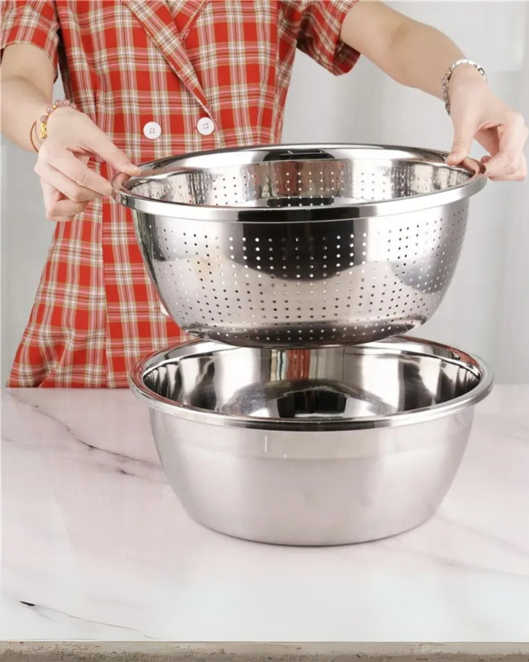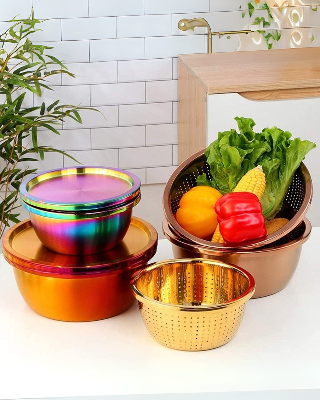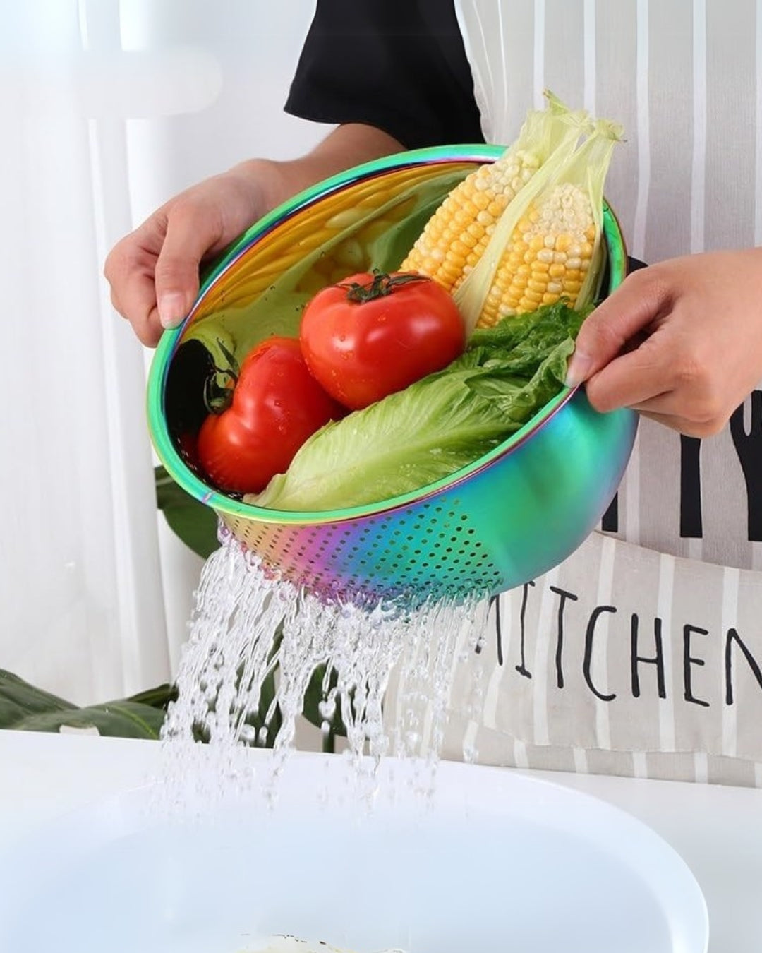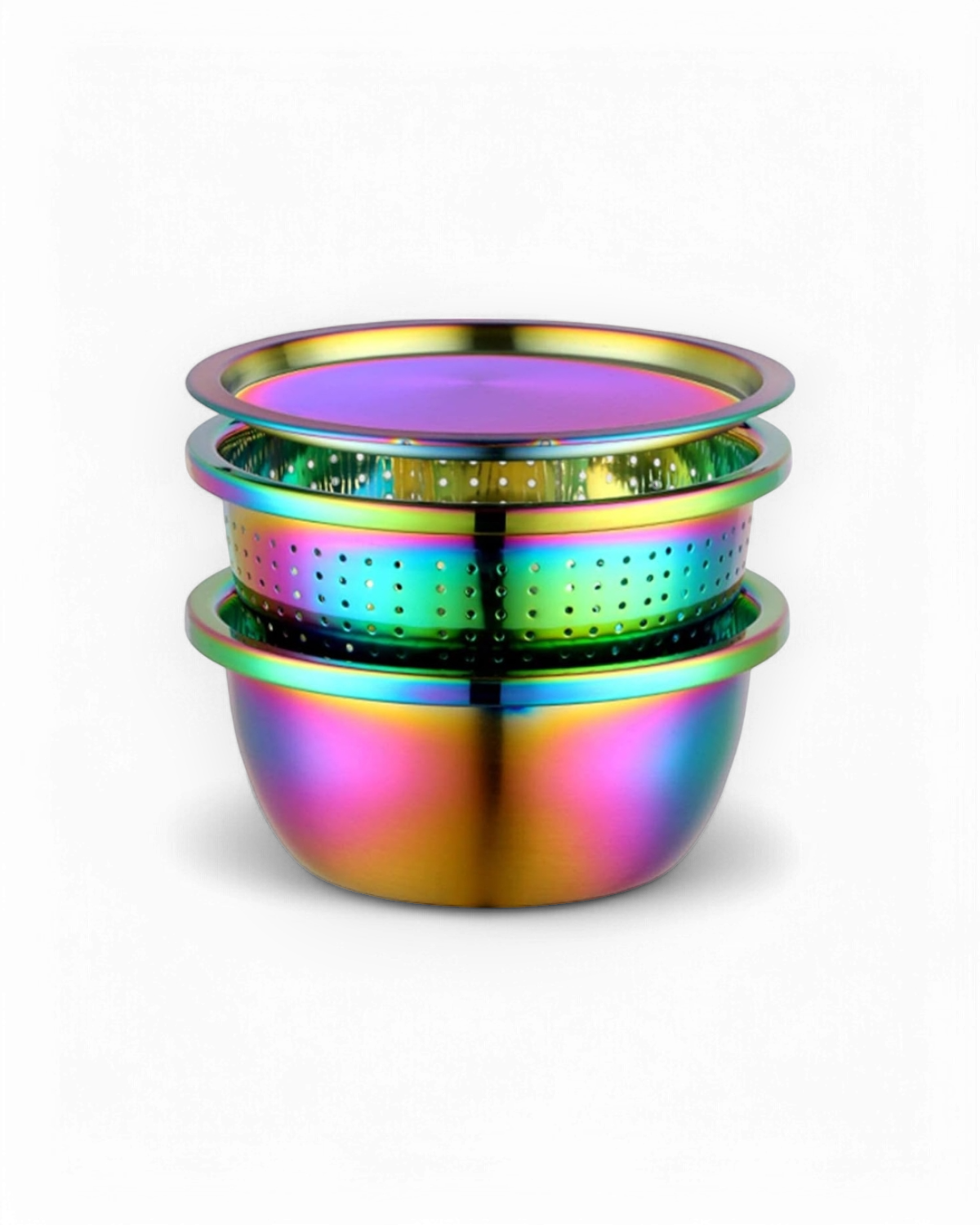 Con una superficie in acciaio inox finemente perforata, Le Doré Éclat è progettato per garantire la massima efficienza, consentendo di grattugiare e scolare senza sforzo, mantenendo gli ingredienti intatti e pronti per la fase successiva della ricetta. La lussuosa finitura dorata non solo valorizza l'estetica della cucina, ma garantisce anche una lunga durata e una facile pulizia.